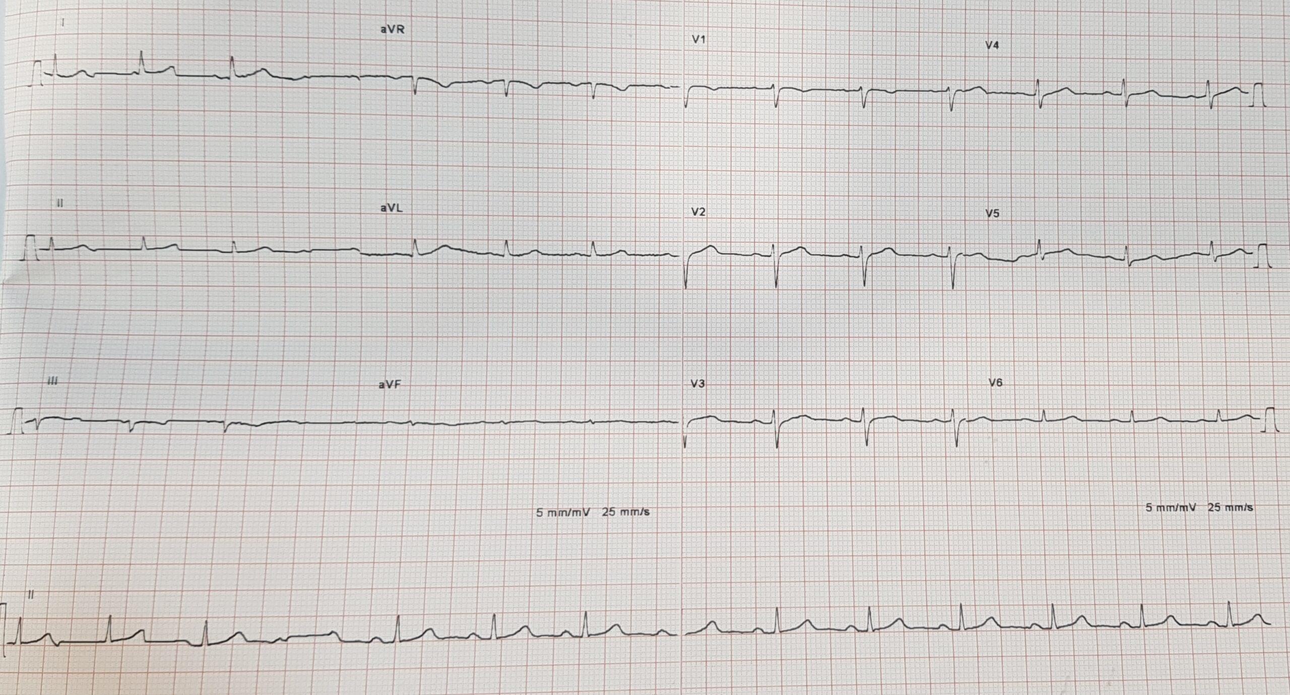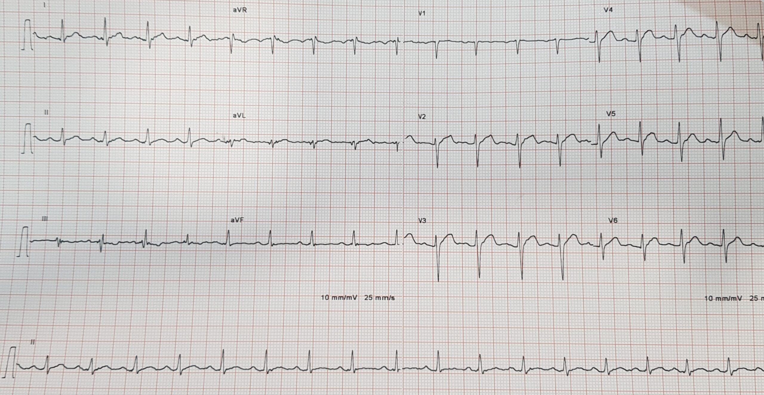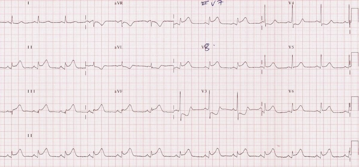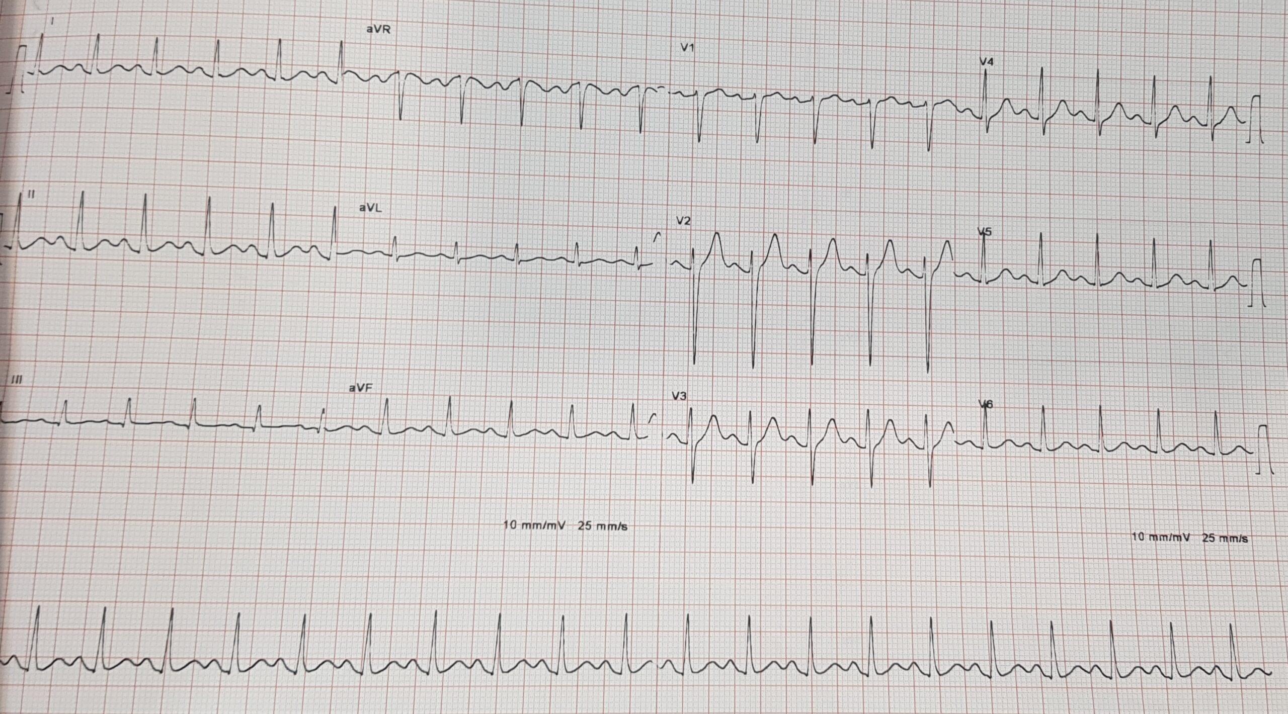 25. A 60-years-old female patient with diabetes presented to you with severe pain in the epigastric region and dizziness. ECG show these changes. What is your diagnosis?