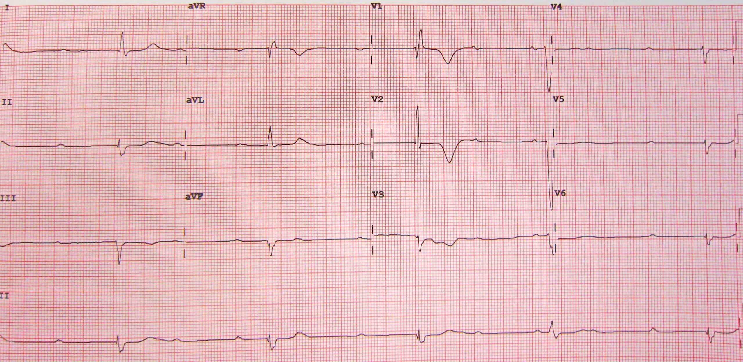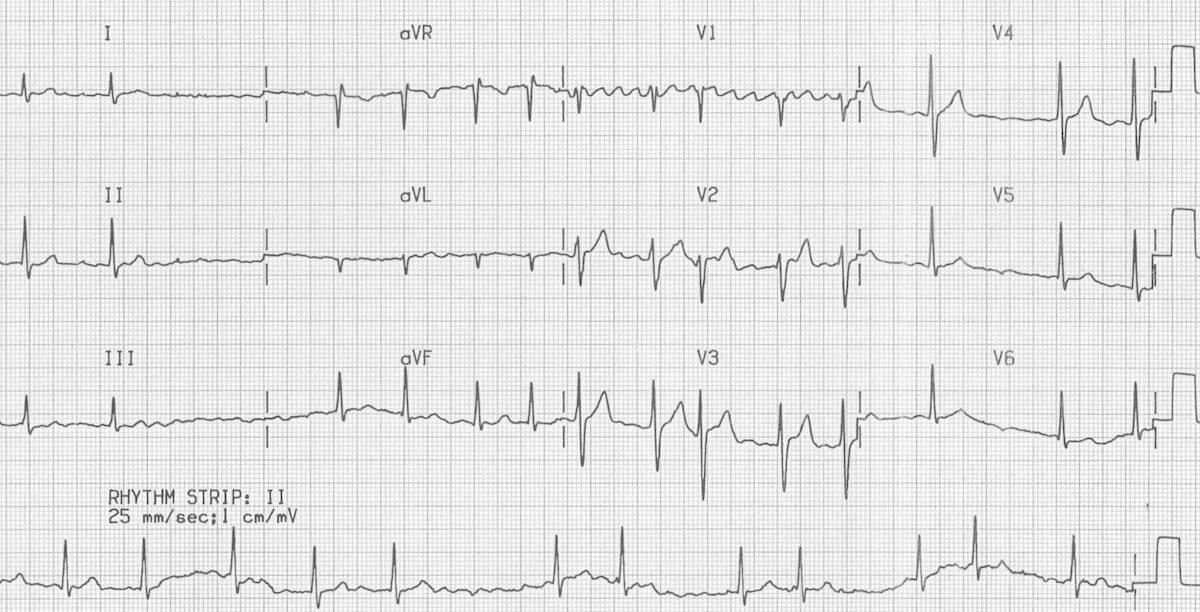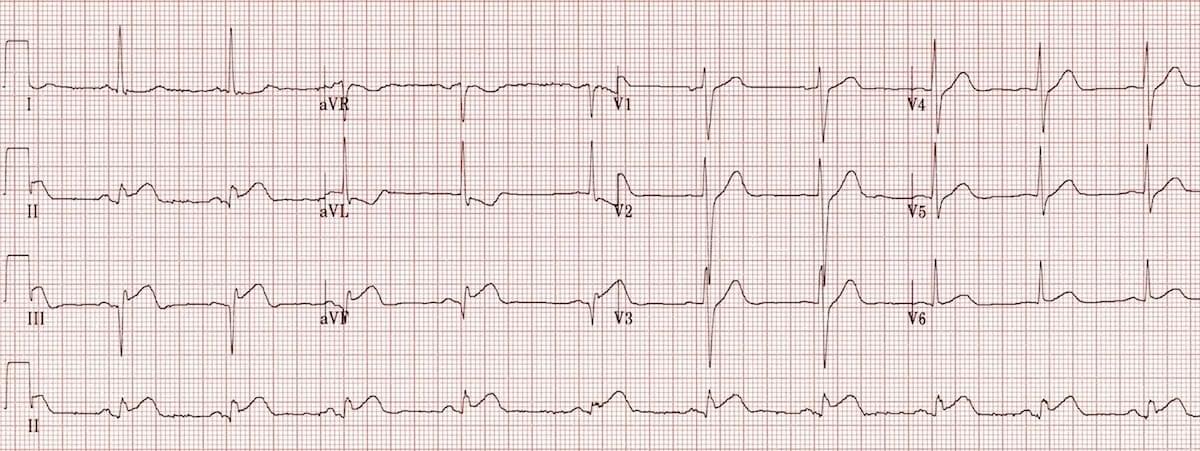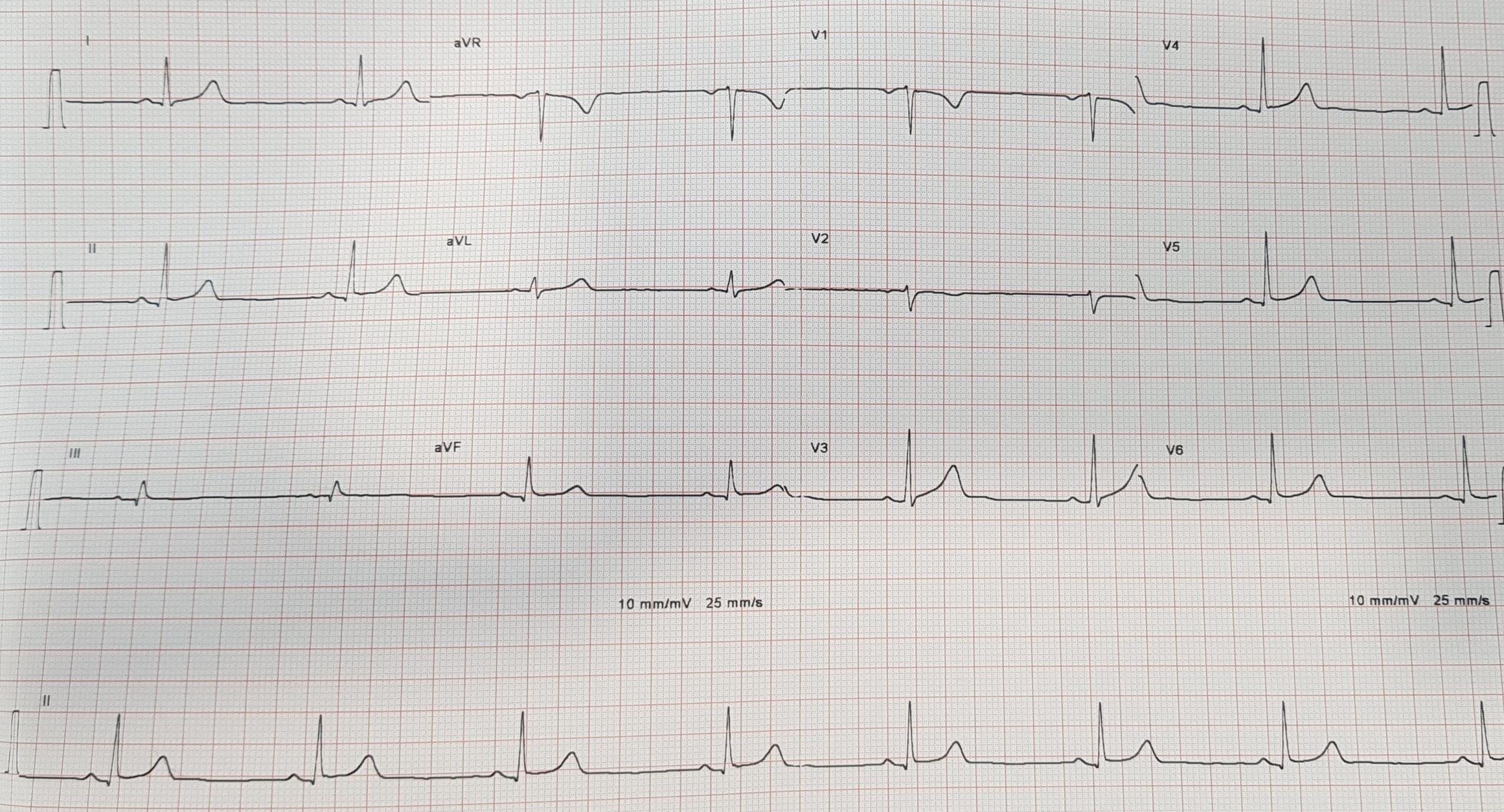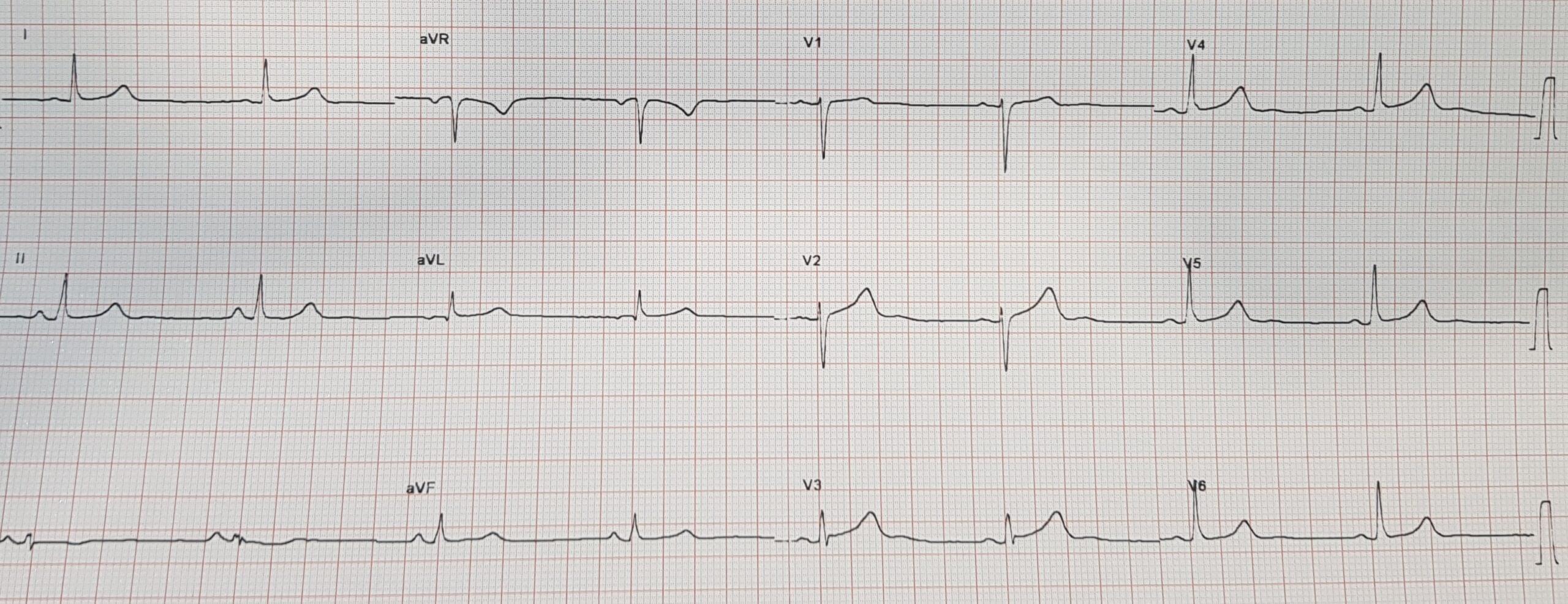 25. A 60-years-old female patient with diabetes presented to you with severe pain in the epigastric region and dizziness. ECG show these changes. What is your diagnosis?